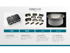 功率模块静态参数测试(DC) | 执行标准:MIL-STD-750,IEC60747、JB/T7626-2013、 GB/T 29332-2012; 试验对象:DIODE、IGBT、MOSFET、SCR、整流桥等功率; 试验能力:检测最大电压:7000V,检测最大电流:5000A 试验参数: 漏电参数:IR、ICBO、ICEO、IDSS、IDOFF、IDRM、 IRRM、ICES、IGESF、IGESR、IEBO、IGSSF、 IGSSR; 击穿参数:BVCEO、BVCES、BVDSS、BVCBO、VDRM、 VRRM、BVR、BVZ、BVEBO、BVGSS; 导通参数:VCESAT、VBESAT、VBEON、VF、VGSTH、VGETH、VTM; 关断参数:VGSOFF 触发参数:IGT、VGT 保持参数:IH、IH+、IH- 锁定参数:IL、IL+、IL- 混合参数:RDSON、GFS | |